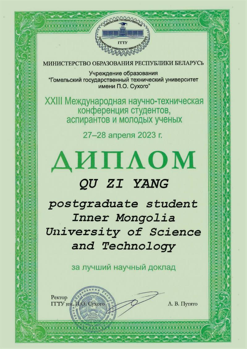 2023年4月27日-28日,白俄罗斯戈梅利国立技术大学第二十三届青年科学家、研究生、员工国际科技网络会议顺利举行。公司研究生曲子洋荣获最佳科学报告奖,为学院争得了荣誉,也展现了beat365正版国际复合型人才的风采。