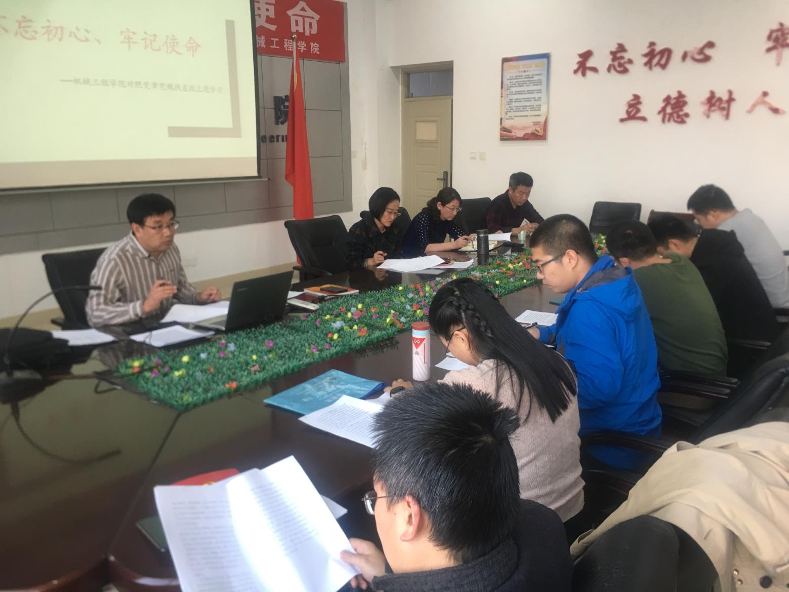 会议传达了学校《关于在“不忘初心、牢记使命”主题教育中对照党章党规找差距的工作方案》的相关要求,就对照党章党规找差距工作做了具体安排和部署,要求大家在认真学习习近平新时代中国特色社会主义思想及党章党规基础上,逐条对照党章、《准则》、《条例》有关规定,召开专题会议,全面查找差距、不足。最后,大家集中学习了《中国共产党章程》、《关于新形势下党内政治生活的若干准则》、《中国共产党纪律处分条例》和《中国共产党廉洁自律准则》相关文件内容,进一步统一了思想,强化了认识。