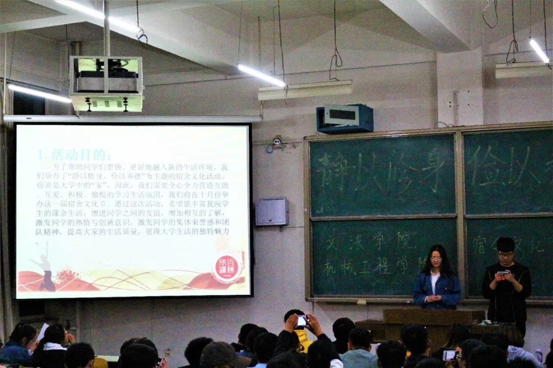 9月27日晚,由beat365正版和文法学院联合举办的“静以修身,俭以养德”宿舍文化节开幕仪式在主教F105顺利进行。参与本次活动的有beat365正版、文法学院员工会干部、各班级生活委员和宿舍长代表。