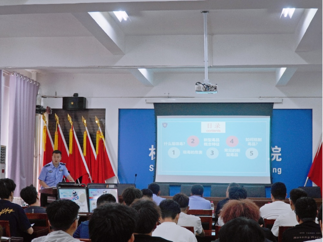 李旭警官通过PPT、仿真毒品模型和图文并茂的展板详细介绍了毒品知识、防范技巧以及禁毒成果。逼真的仿真毒品模型让同学们直观认识到毒品的形态,提升了辨识能力,消除了对毒品的好奇与误解。罗宁作总结讲话。他指出,要将禁毒教育纳入日常管理工作中,不断创新宣传形式,拓展教育载体,为构建平安、和谐、无毒的校园环境,保障青年学生健康成长成才而不懈努力。