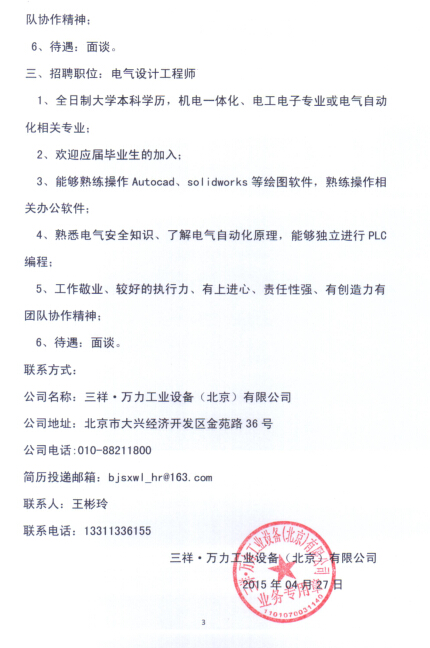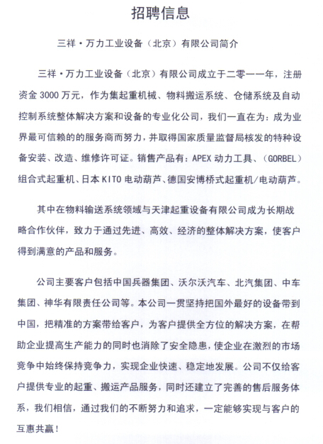 招聘信息:三祥万力工业设备(北京)有限公司