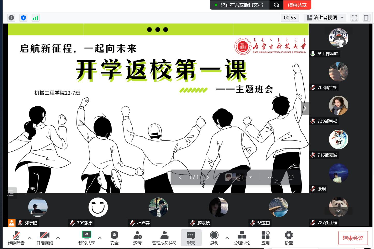 本次主题班会活动主要围绕生命健康教育,爱校荣校教育,学风教育三部分展开,同时各位班主任老师对同学们在返校前,返校中,返校后各环节需要注意的事项进行了温馨提示,保证同学们以崭新的精神状态迎接新学期的到来,不断努力谱写属于自己的青春华章!