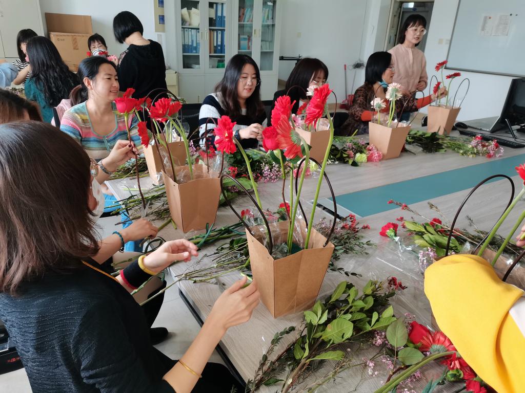 活动中,花艺师为大家讲解插花艺术及鲜花养护方法等知识,介绍每一种花材的特点,通过花艺师现场演示,女教工亲身体验插花艺术。大家发挥创意,将弗朗、玫瑰、康乃馨、尤加利叶、满天星等多种花材,通过修剪、整枝,颜色搭配和谐,高低错落有致,制作出一份份形态各异、娇艳欲滴,象征着祝福与美好的插花作品。