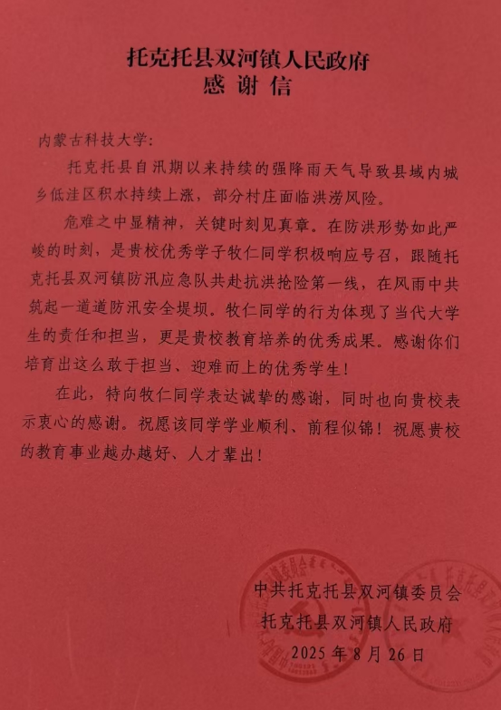 近日,beat365正版收到了一封来自托克托县双河镇人民政府的感谢信。信中对公司2022级机械设计制造及其自动化专业牧仁同学在防汛抗洪中的英勇表现给予了高度赞扬,并向学校致以诚挚谢意。