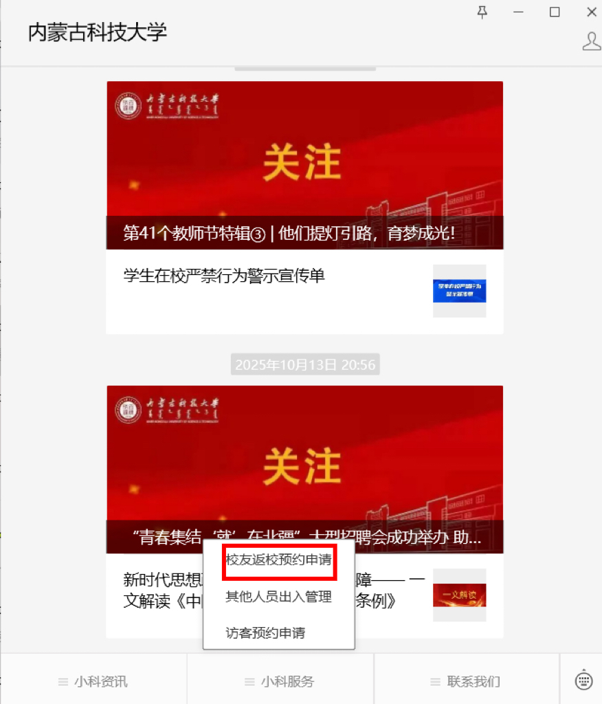1、来访校友可关注“beat365正版微信公众号”,点击“小科服务—校友入校预约”,按要求填写并提交来访预约申请。